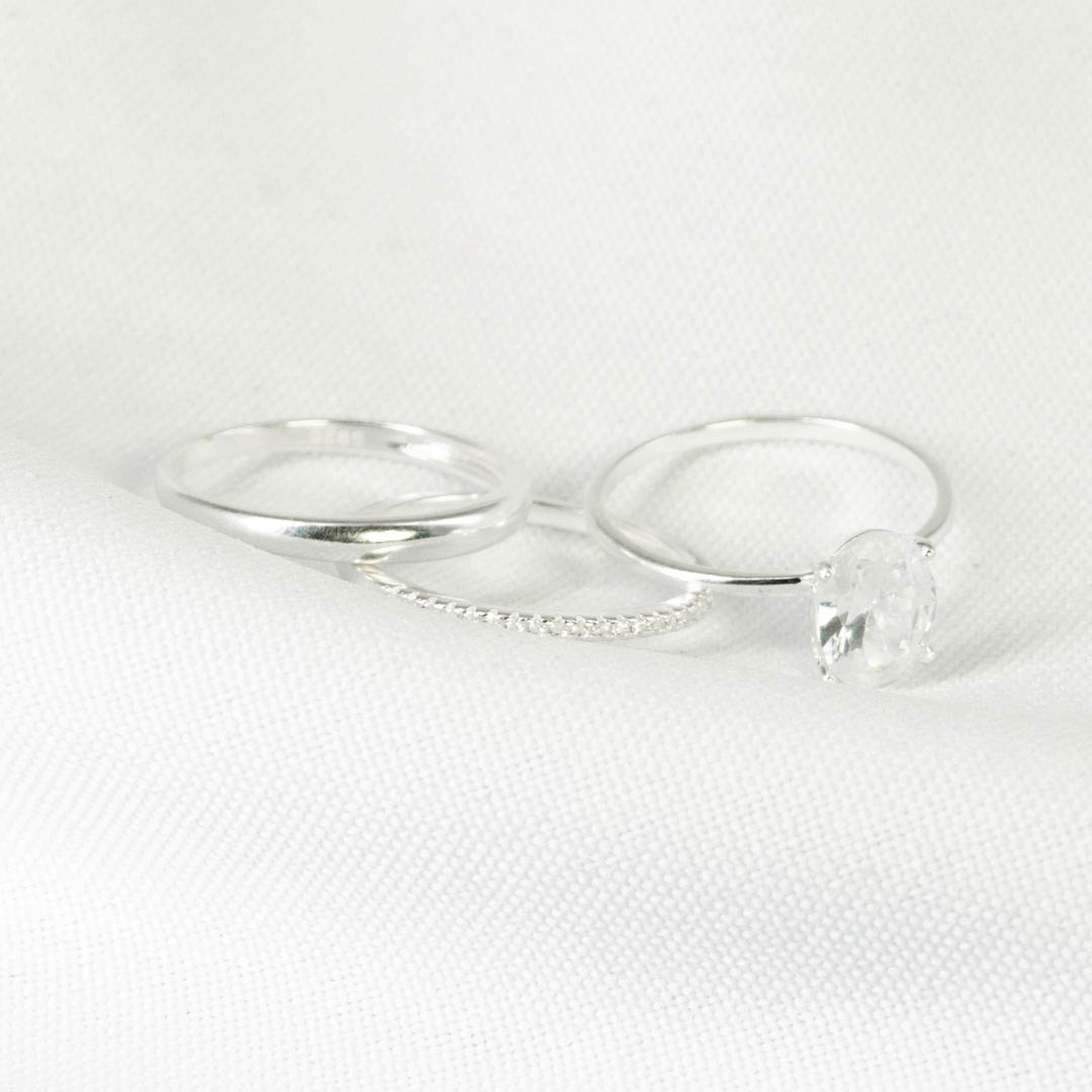 TRIO DE ANILOS SOLITARIO OVALO , LISO Y BANDA CIRCONES